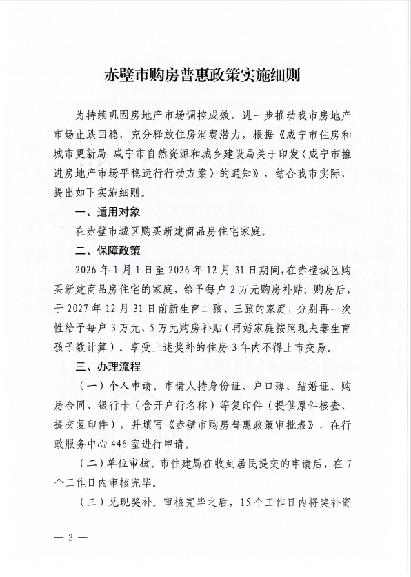 2026年1月1日至2026年12月31日期间,在赤壁城区购买新建商品房住宅的家庭,给予每户2万元购房补贴;购房后,于2027年12月31日前新生育二孩、三孩的家庭,分别再一次性给予每户3万元、5万元购房补贴(再婚家庭按照现夫妻生育孩子数计算)。享受上述奖补的住房3年内不得上市交易。