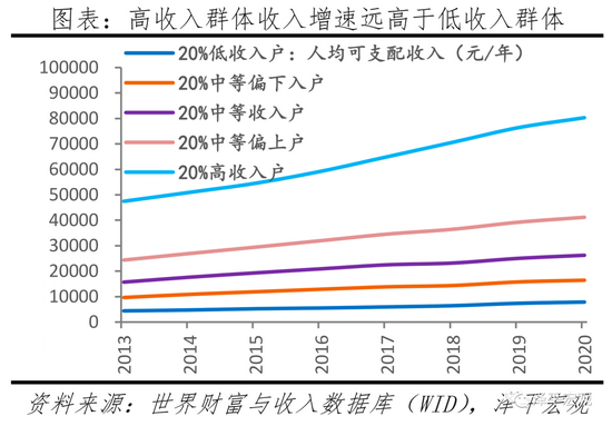 税前收入前10%的人群收入所占比重由2000年的35.56%提高至2019年的41.43%,中等收入群体逐渐成为“夹心饼干”,2017-2019年,中等收入群体(中间60%)收入平均增速6.3%,低于低收入群体的9.3%、高收入群体的7.9%和全国的7.1%。疫后全球经济复苏,出现了一个新现象,即“K型复苏”。在经济总量复苏的背景下,由于货币超发、资产价格泡沫化、通胀上升,全球收入分配差距拉大,引发社会不稳定因素,“富人通胀、穷人通缩”导致了社会结构恶化、民粹主义盛行、逆全球化、社会阶层固化、生育率下降、社会活力降低等一系列深层次问题。