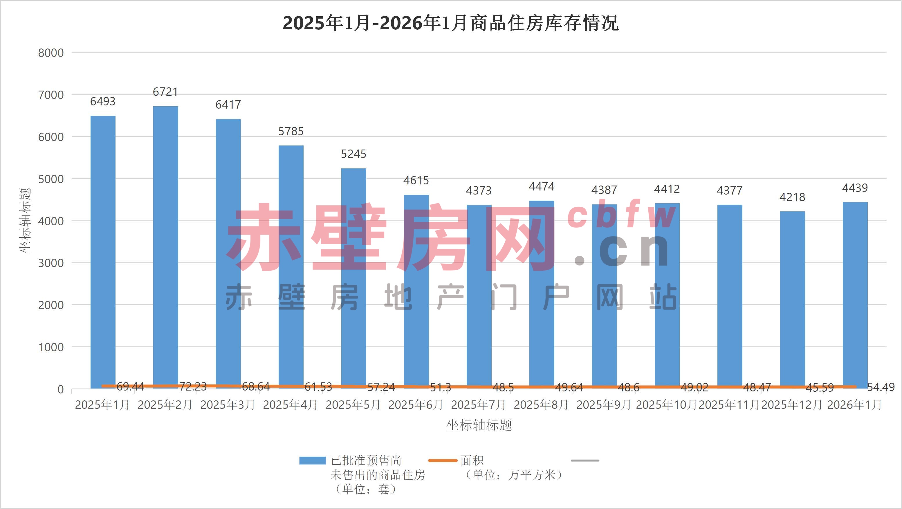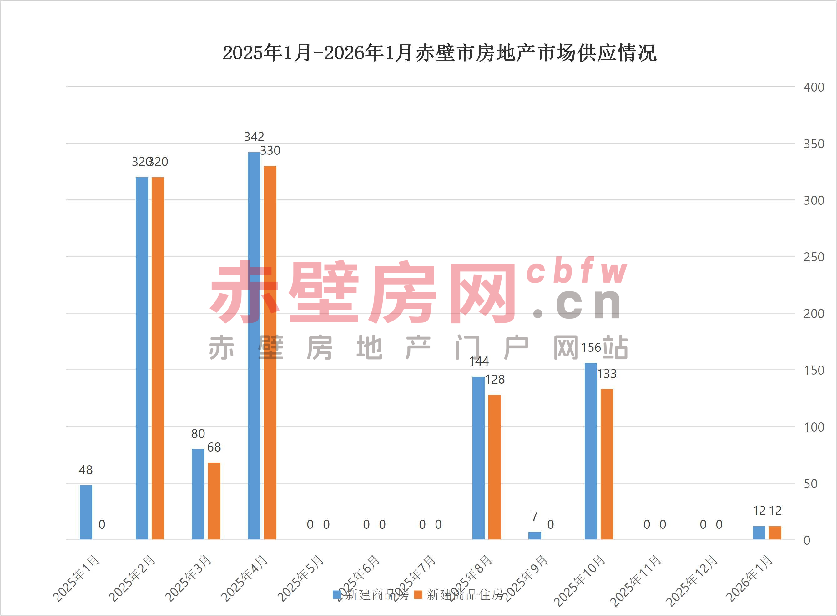 2026年1月,赤壁市房地产市场整体运行平稳,供需结构呈现积极变化。新建商品房供应环比显著回升,市场交易活跃度同比大幅提升,反映出市场信心的逐步恢复。与此同时,商品住房库存保持在合理区间,为市场健康发展提供了稳定基础。下面将从供应、交易、库存三个方面具体介绍本月市场运行情况。