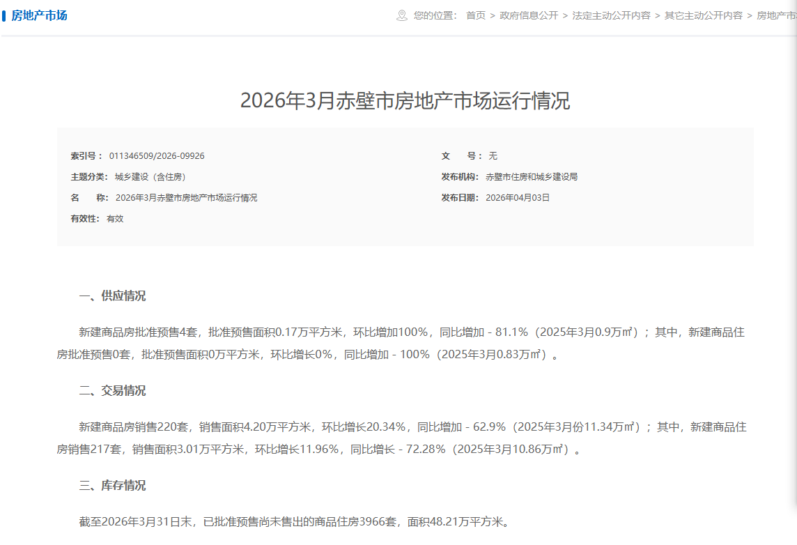 截至2026年3月31日末,已批准预售尚未售出的商品住房3966套,面积48.21万平方米。