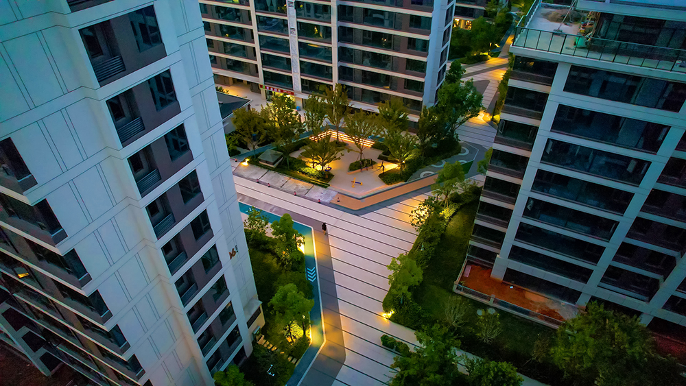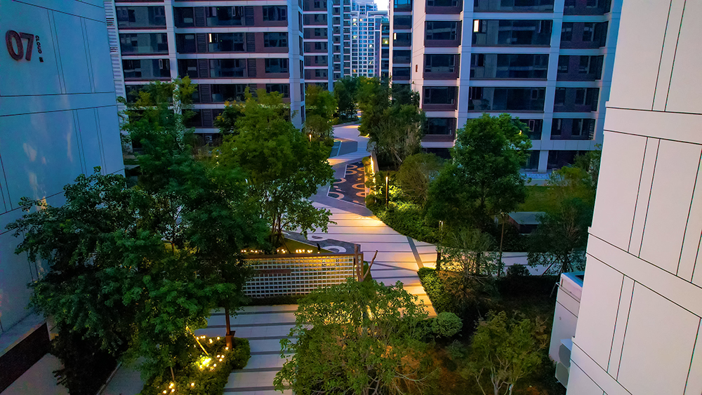 当夜幕降临,暖黄色的灯光次第亮起,蜿蜒于园林小径与楼宇之间,将白天的风景温柔笼罩。归家的业主漫步在静谧的园中,安保人员的身影在灯光下定时经过,这份宁静与守护,让夜晚的社区成为一种安心的享受。