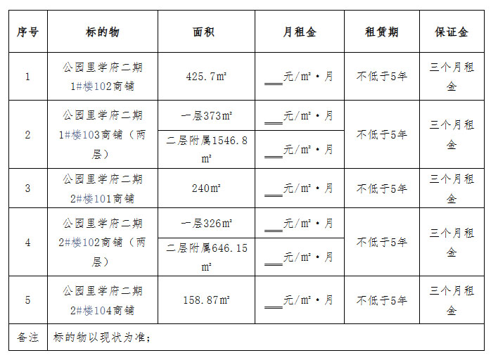 公园里学府二期1#楼、2#楼、3#楼商铺对外招租公告一、租赁标的1、竞价标的