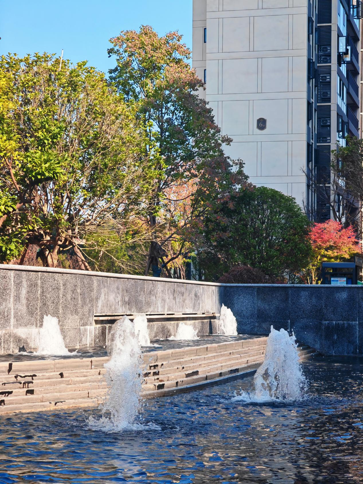 走进园区,气派门楼率先映入眼帘,大气迎宾喷泉跌瀑水景潺潺流淌,水雾氤氲中折射出细碎光斑,旁边挺拔苍劲的榉树叶片渐染金黄,细碎金叶在阳光下闪烁,踩在落叶铺就的草地上,沙沙作响是初冬最动听的絮语。