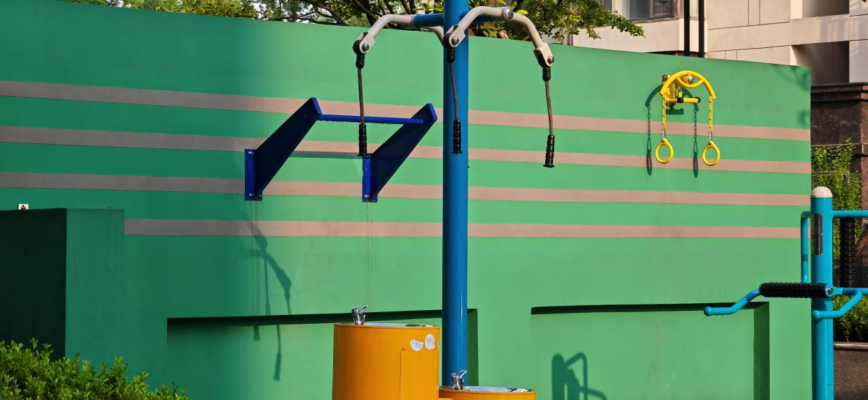 不远处的老年健身区,器材在清晰的枝桠下井然排列,为晨练与漫步的长者提供了一片沐浴阳光、活动筋骨的惬意场所;这里洋溢着笑语与活力,成为冬日园区里最温暖的风景。