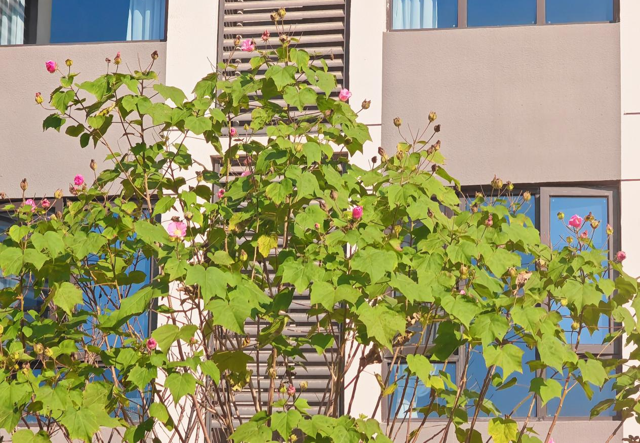 11月的木芙蓉花格外坚韧,粉色的花朵依然迎风绽放,“拒霜花” 的美名与园区 “人文 + 生态 + 智慧” 的设计理念不谋而合;