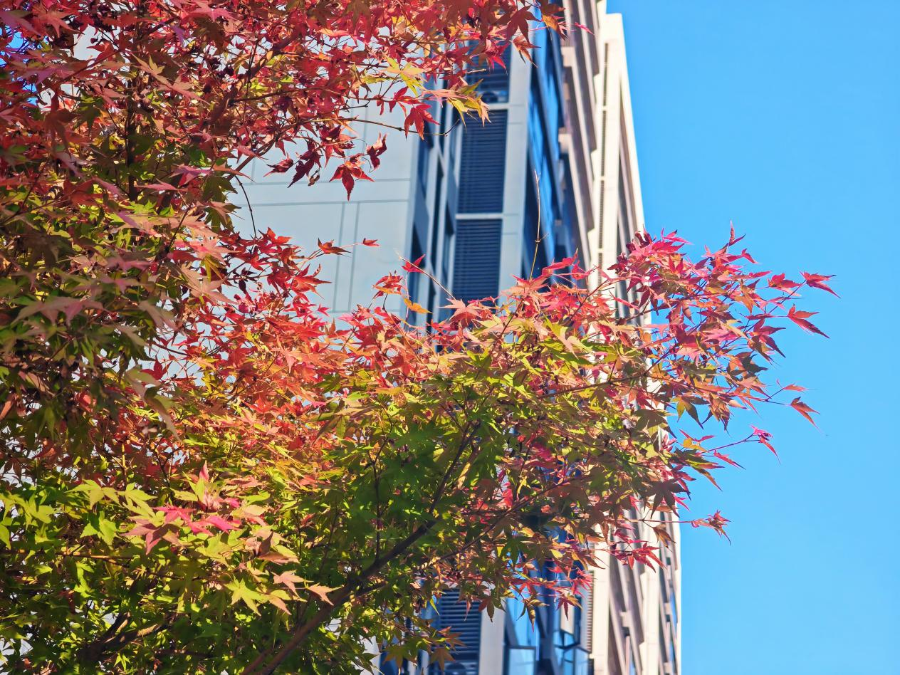 转角处的银杏林早已换上 “金衣”,扇形叶片在暖阳下通体透亮,一阵风过,金叶簌簌飘落,铺成柔软的 “黄金毯”。