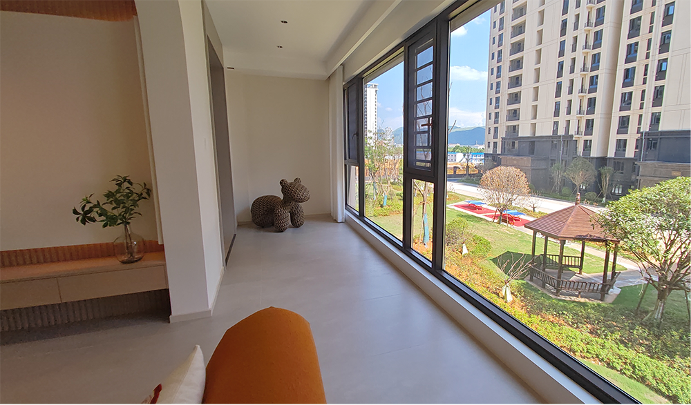 南向全景阳台延伸空间感:不仅引光入室,更成为先生品茶会友的雅致社交台,或是全家沐浴阳光、眺望公园景致的日常仪式区。