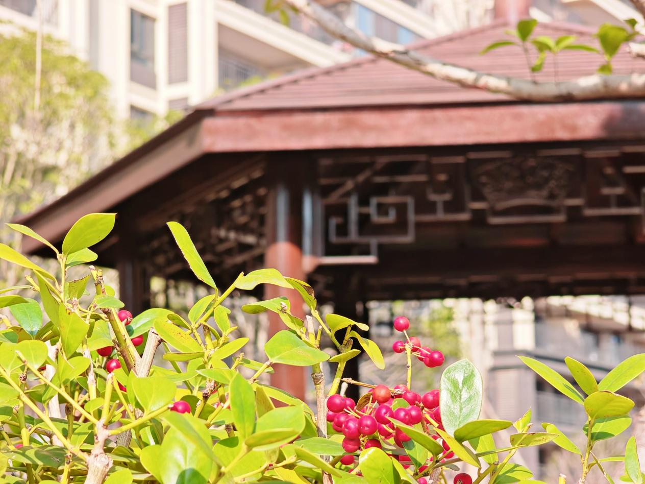 公园里学府二期的园林,古典的造园手法与现代的审美悄然融合。桂香八角亭飞檐轮廓优雅,枸骨的红艳呼应。走在这里,你会想起那句“画里寻居,诗中筑园”——原来古人向往的风雅,如今就藏在自家的楼下。